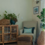 The master bedroom features rattan and cane furniture and lush green plants which, when combined with the Resene Spanish White and Resene Hermitage walls, give the room a resort look.