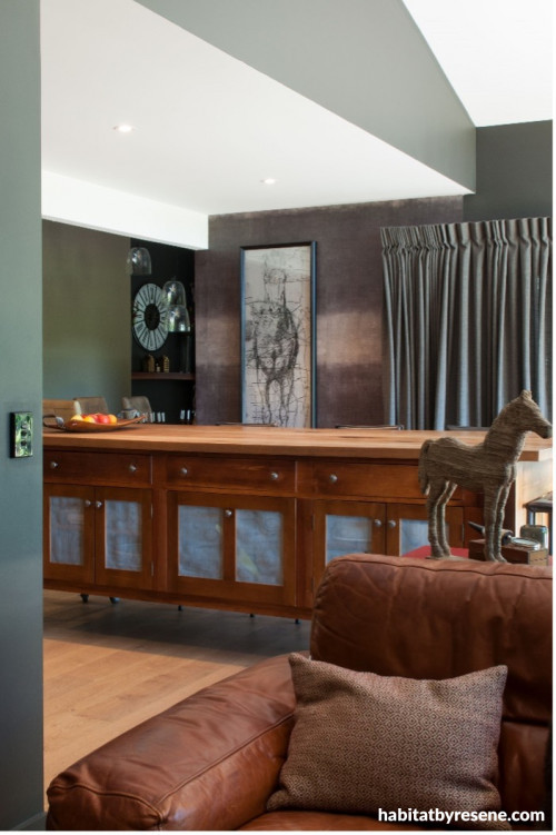 The snug is painted in Resene Ironsand and joins onto the dining room painted in Resene Double Colins Wicket.