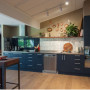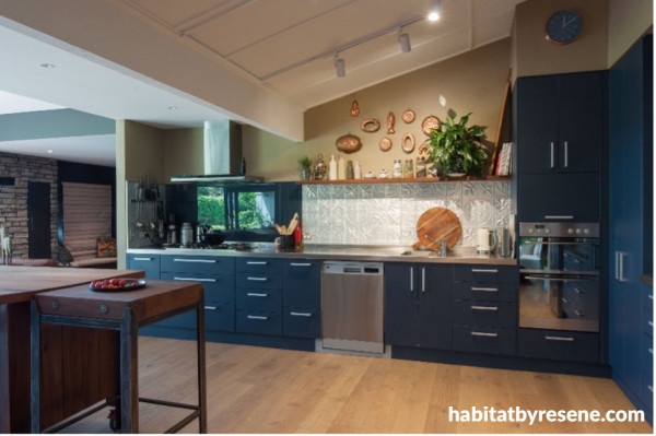 The wall colour of the kitchen is Resene Double Colins Wicket. The kitchen cabinets are 20 years old but are still going strong, for a similar dark blue shade try Resene Dark Knight.