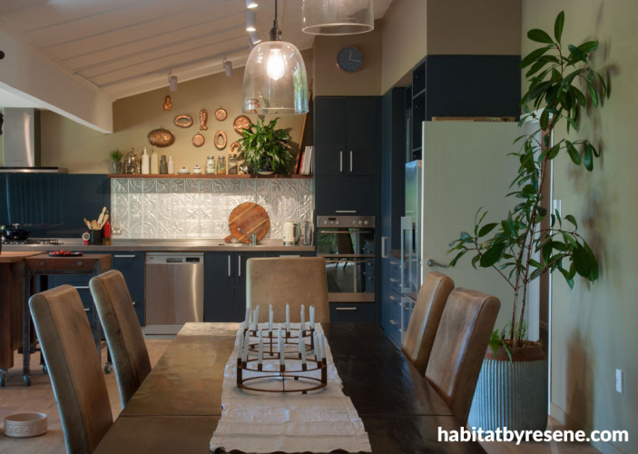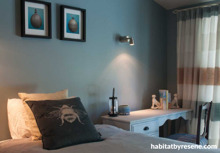 Meg is an avid DIYer who is a dab hand with the secateurs and chainsaw as well as a paintbrush – she’s has done most of the painting of her home herself. This includes parts of the exterior which she painted in Resene Ironsand and Resene Napa. There are more colourful choices in the interior including Resene Powder Blue from the Karen Walker Paints collection in a guest bedroom and Resene Double Colins Wicket in the dining room which pairs well with the blue kitchen cabinets which are 20 years old.