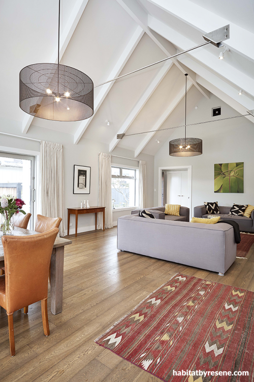 If you’re using a neutral scheme, play up some features. We used Resene Spark metallic on the balustrade rod, had a copper front door made, created a paint-effect on the kitchen rangehood, and used perforated industrial sheets to make the main light shades. These elements give the house a lift.