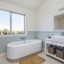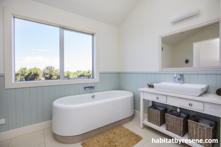 The ceilings and trims are Resene Rice Cake, which has a sea-foam tinge to it, so we took that colour into the bathrooms and teamed it with a dusky sea blue for the tongue-and-groove paneling, Resene Periglacial Blue.