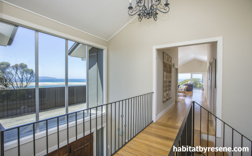 The owners chose wrought iron balustrades for the ‘bridge’ to add a bit of character. The walls are Resene Double Parchment and the trims are Resene Rice Cake.
