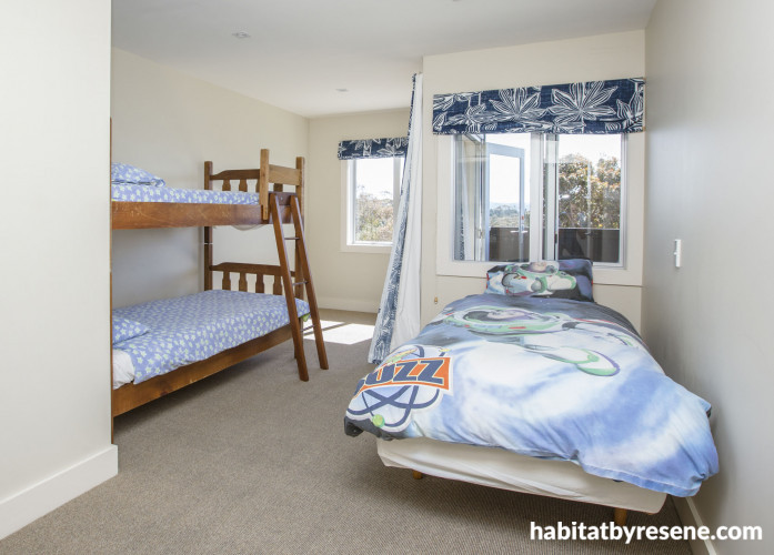 We wanted colour but not strong colour that would overwhelm the view. So we took a lead from what you see outside, and used our interpretation of a sand colour – Resene Double Parchment and Resene Parchment – as the main wall colours. The downstairs rumpus room gets less natural light than upstairs so we chose the slightly creamier Resene Wheatfield for the walls there.