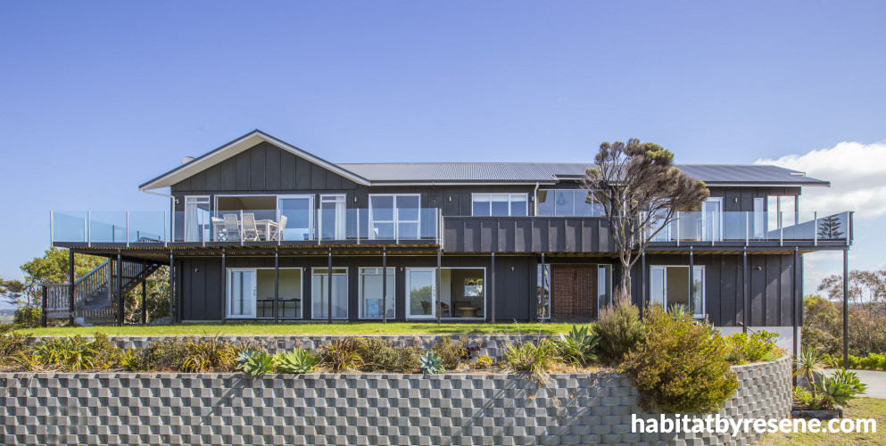 The exterior is board and batten so suits a dark colour. We tried a few but Resene Bokara Grey has just the right amount of warmth compared to a straight black. Resene Bokara Grey is also the colour of the Hen & Chicken Islands and the seaweed that gets washed up on the beach.