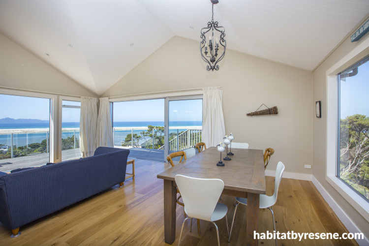 Resene Double Parchment was chosen for the walls and Resene Rice Cake for the ceiling and trims to echo the colours of the sand dunes that feature in the view out the windows.