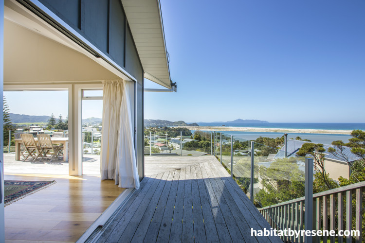 The corner of the house becomes see-through as large sliding doors open up to the view. The exterior is painted in Resene Bokara Grey.