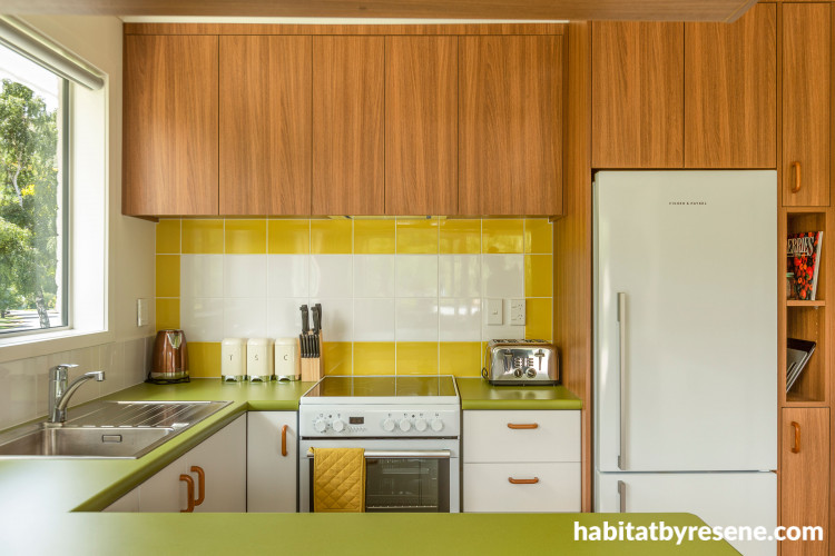 With retro wood cabinetry and a groovy green benchtop, the chosen paint colour needed to play bridesmaid to the kitchen design – support but not steal the thunder. Resene Half Spanish White is the perfect off-white choice – understated and classic.