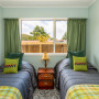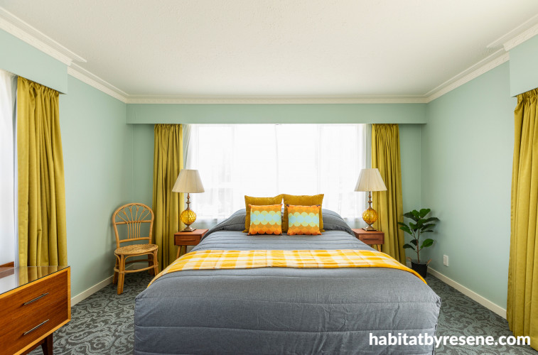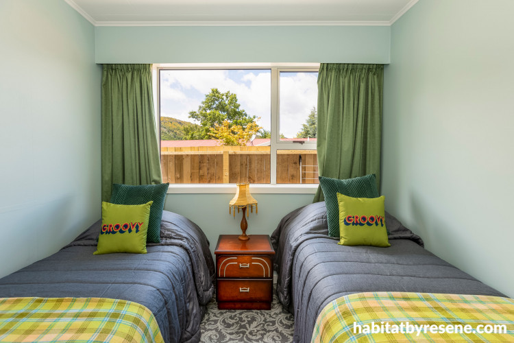 No homage to the 70s is complete with the classic itchy-yet-soft wool blanket. The green tones in this twin bedroom match beautifully with the restful walls painted in Resene Paris White. The ceiling is painted in Resene Eighth Spanish White.