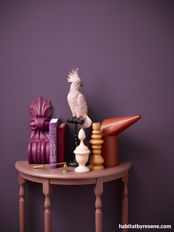 Despite this deep purple being a strong colour, it is surprisingly adaptable. However, if it’s your first time trying out a striking shade, a good rule of thumb is to stick to the same part of the colour wheel and add-on less-vibrant layers until you reach the right intensity. In this room, the Resene Couture wall has been layered with accessories in a range of pinks, plums and fuchsias including Resene Ringo, Resene Dawn Chorus, Resene Stetson and Resene Vanilla Ice. To mix it up and keep things from looking too tone-on-tone, the designer has incorporated a candlestick in Resene Entourage, an antique gas canister in Resene Pioneer Red and painted the bird’s perch in Resene NeroProject by Kate Alexander, image by Melanie Jenkins
