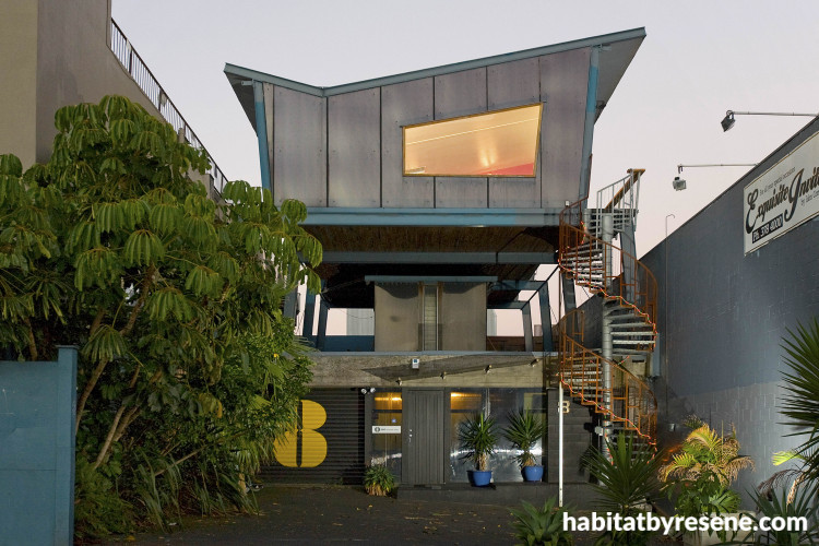 His open-plan, one-bedroom apartment, designed by architectural designer Mark Callender of CreativeArch straddles the warehouse on sloping legs, which are reflected by the complementary sloping walls. David built it himself, two years ago, and made material choices that reflected his personality: practical. “I’m an engineer, so I put function ahead of form,” he says. For the exterior, intense blue and bright yellow add impact to the steel façade. Inside, he kept the interiors simple and bold, with an emphasis on pale wood, stainless steel and a punchy Resene Jalapeno wall colour.