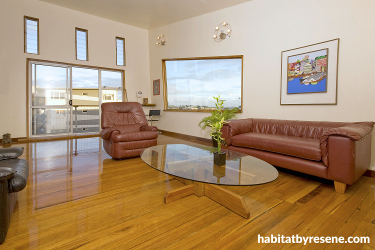 The main living space of the house is open plan, with the red feature wall drawing the eye to the unusual sloped walls and roofline. Many of the furniture pieces were sourced through TradeMe. The red and black bar stools came from BBQ’s and More in Ellerslie.