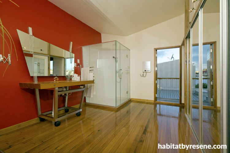 The movable stainless steel island bench in the kitchen was custom-made by RH King. Owner David Payne built the timber using remnants from the hardwood flooring timber.