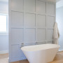 The dreamy ensuite was built with a partition wall of large board and batten squares painted in Resene Silver Chalice, separating the bathtub from the shower and toilet to create a sanctuary-like presence. To finish, they painted the walls in Resene Powder Blue with Resene Half Bianca for the trims.
