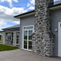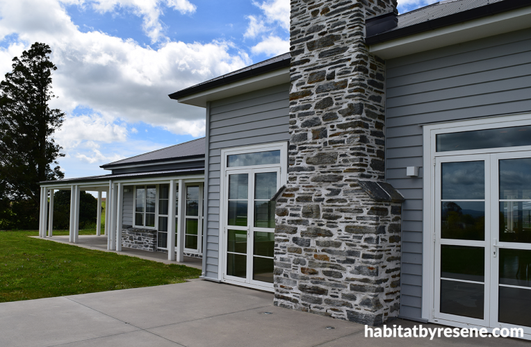 The homeowners chose Resene Delta for the exterior of their modern farmhouse, with Resene Grey Friar for the roof, and Resene Half Bianca for the soffits and joinery.