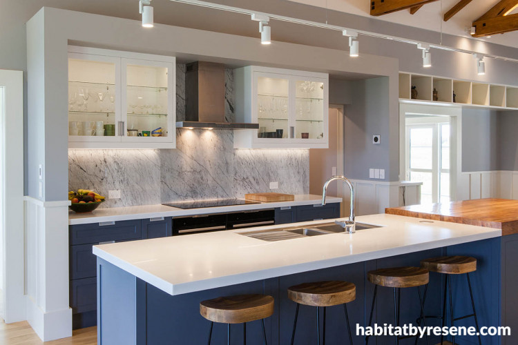 At the heart of this modern farmhouse is the kitchen and living area, with a beautiful mix of Resene Silver Chalice on the walls and Resene Half Bianca on the trims and lower wall panels. Resene Tuna is a standout feature on the cabinetry.