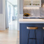 The floors are made of tawa milled from the homeowners' farm, and lead out from the living area to the hallway. The colour palette of Resene Silver Chalice and Resene Half Bianca also continues throughout. On the cabinetry, bold Resene Tuna is unique to the kitchen area.