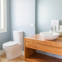 Hidden on the other side are the toilet, vanity and shower, against walls in Resene Powder Blue and trims in Resene Half Bianca.