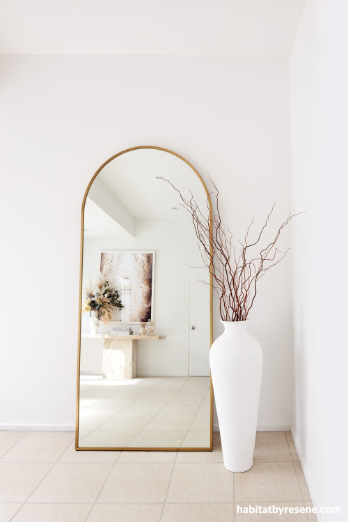 The arched mirror in the entranceway fills some of the vertical space and bounces light around, reflecting it to make the space more visually interesting. The walls and ceiling are painted in Resene Alabaster with Resene Double Alabaster on trims.