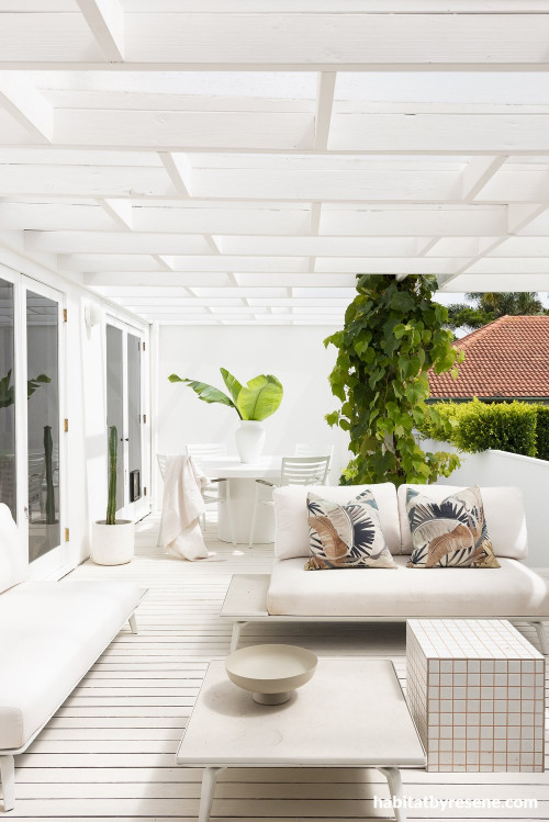 A beautiful grapevine trails down the stair balustrade and looks striking against the white walls painted in Resene Alabaster. Resene Walk-on flooring and paving paint was painted onto the deck tinted to Resene Blanc. This space is refreshed and ready for relaxing or entertaining.