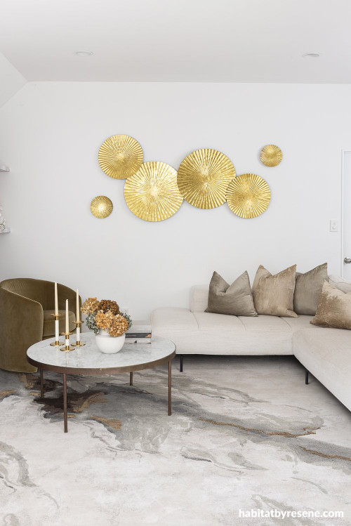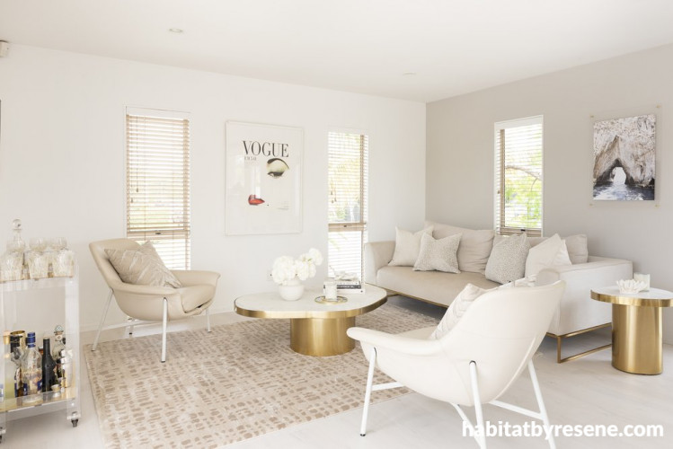 Shelley’s chic white living room, painted in Resene Alabaster on walls and ceiling and Resene Double Alabaster on trims. The touches of gold and modern neutral furniture give this space a timeless and elegant feel.
