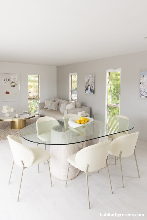 The minimalistic dining and living space are made bright and open by the white and neutral paint and decor. Resene Alabaster was painted on the walls and ceiling and Resene Double Alabaster on trims.