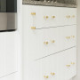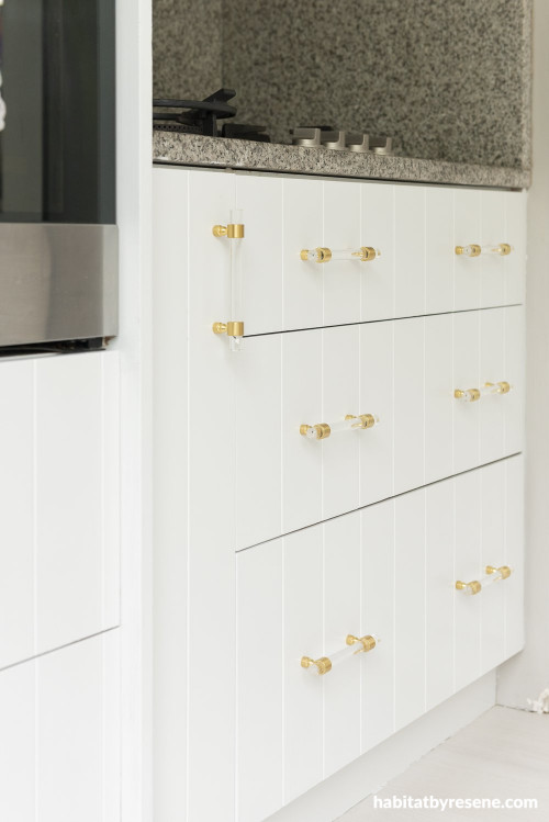The kitchen is made timeless and chic with gold finishes and neutral tiling. The cabinetry has been refreshed with paint using Resene Half Sea Fog, a classic white with a blackened edge.