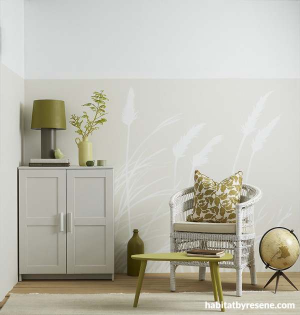 This calming colour palette is set off with minimalistic furnishings that blend seamlessly with the walls. Walls in Resene Half Joanna (bottom) and Resene Quarter Alabaster (top). Sideboard in Resene Half Truffle, lamp in Resene Mondo on the base and Resene Half Pravda on the shade, footstool in Resene Half Pravda, plant pot in Resene Quarter Alabaster and vase in Resene Pravda. Chair from French Country, cushion from Collect Living, rug from The Ivy House. Project by Kate Alexander, image by Bryce Carleton