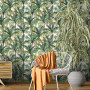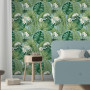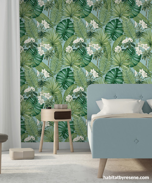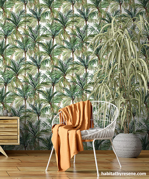 Resene Wallpaper Collection M37801 is sitting pretty in a living room with palm leaves dotting the walls. Paint the ceiling and trims in Resene Bianca for contrast.