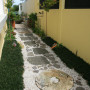 The side fence of Sara Noble’s home is painted in Resene Moonbeam to match the main exterior colour, acting as a frame for the quirky pathway design. Image Sally Tagg.