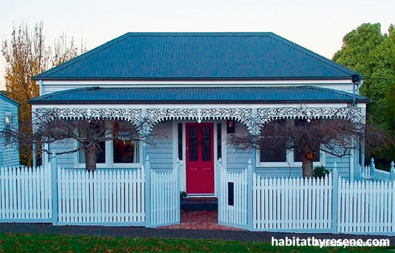 This quirky picket is painted in Resene Half Pearl Lusta while the house is Resene Bluegrass with a Resene Copper Rust fascia. Image Frances Oliver.