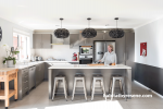 The kitchen is part of a large open plan area, painted in Resene Half Silver Chalice, with cabinets painted in Resene Talisman. The half height colour on the wall to the side is painted in Resene Bokara Grey.