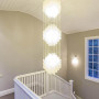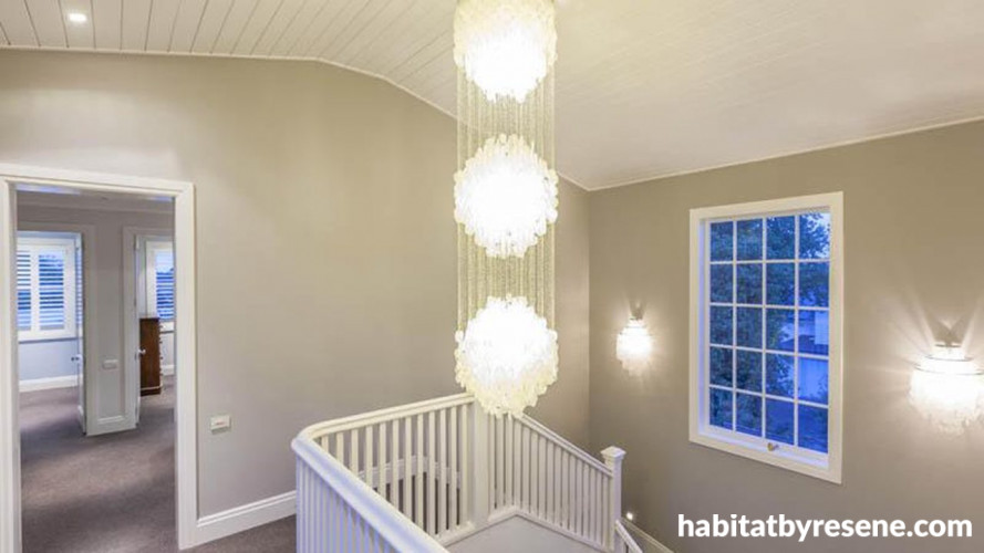 A stunning Verner Panton mother-of-pearl chandelier inspired the colour scheme with its subtle neutrals, creams and pale mauves. The walls are Resene Cloud.