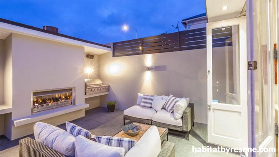 A sensational spot for summer evenings, this courtyard with its outdoor fireplace is finished in Resene Akaroa.