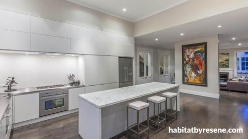 Resene Wan White is used on the almost seamless kitchen cabinets, as well as the doors and trims.