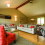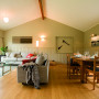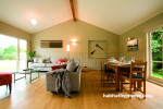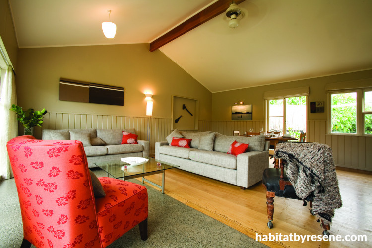 Textural elements include panels of tongue-and-groove to dado height with walls painted Resene Half Tea. Touches of red pop out against the warm tones. This is the living room of the Mara cottage.