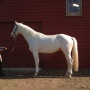 Anne’s magnificent white Oldenburg stallion, Ike, in front of the barn, painted in Resene Kenyan Copper. The barn has Resene Mondo bargeboards (not pictured). All the farm buildings are this colour scheme.
