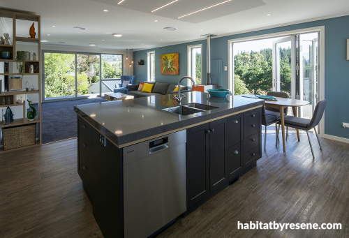 The feature wall in the open-plan living area competes with the strong sunlight and vivid outdoor greenery, so needed to be a strong bold colour to balance the impact. I chose Resene Gothic as it is bright, clean and fresh.