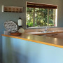 The kitchen bench painted in Resene Inside Back echoes the home's sea views. The main living area, kitchen and hallway in Resene Inside Back.