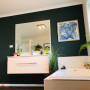 The main bathroom is a lush green paradise with the main wall painted in Resene Jurassic, remaining walls in Resene Half Secrets and ceiling and trims in Resene Alabaster