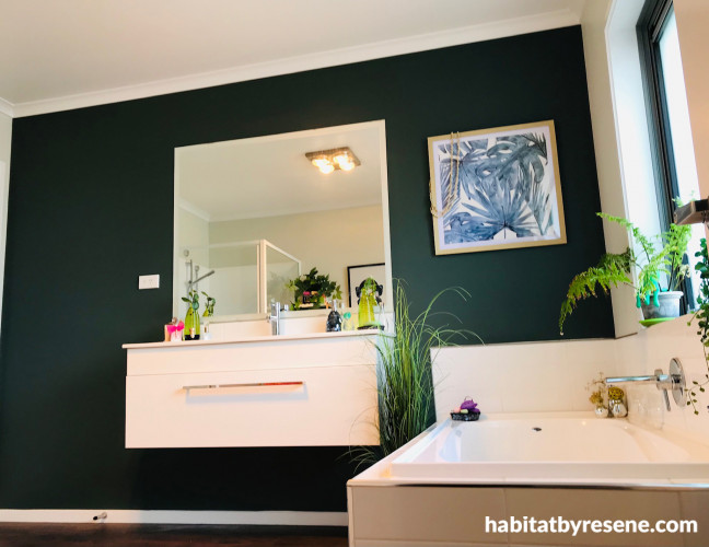 Vanessa got to work. Taking inspiration from the cover of habitat by Resene 2022 Autumn/winter edition, Vanessa was drawn to Resene Jurassic. She decided to use it as the feature colour in the north-facing kitchen, dining room and lounge. “Resene Jurassic is deep and dusty, slightly muddy and evokes a feeling of a long-forgotten Jurassic landscape many million years ago when the dinosaurs roamed,” Vanessa says. Coupled with new dark flooring, the kitchen was transformed into a space with a ‘whiskey den’ vibe. She ended up loving the sultry shade so much she also used it in the two bathrooms.