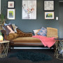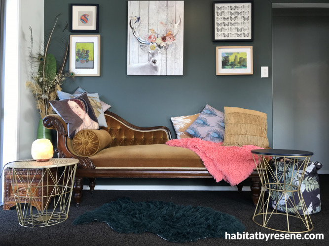 “Be bold, be brave, don’t be afraid to create something that is completely your own to tell your story,” says Vanessa. The antique chaise lounge is striking against a backdrop of Resene Jurassic, with right side table and top photo frames painted in Resene Indian Ink.