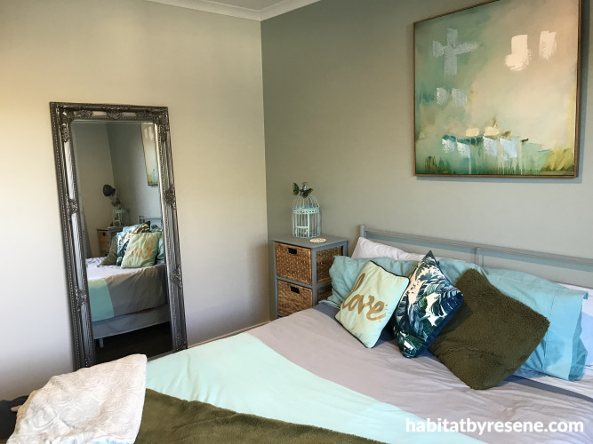 Continuing the feature wall theme and looking for colours that stay within the natural landscape family, moody grey-green Resene Half Innocence was the choice for Alex’s bedroom. For the guest bedroom Vanessa opted for a dewy green, found in the aptly named Resene Haven. Like many renovators, Vanessa found once she’d started painting it was difficult to stop, so she used the leftover Resene Half Innocence to paint the furniture in both bedrooms, tying together the look.