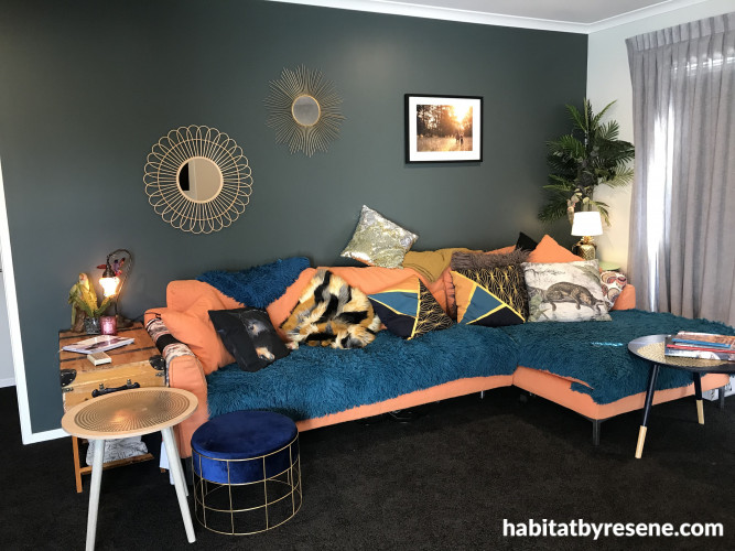 Vanessa says she also fell in love with another colour spotted in a different issue of habitat magazine, Resene Indian Ink. It was the perfect dark hue to add depth to the lounge against the feature wall and antique furniture that she had recently purchased including an antique gold chaise lounge purchased from a local artisan business, Belish Boutique. Employing the midnight blue as an accent colour, Vanessa painted various items of lounge and dining room furniture including her grandmother’s 1950s sewing table.