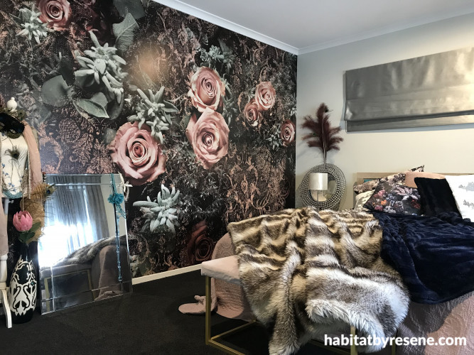 After the easy decision of using Resene Jurassic as the ‘anchor’, Vanessa searched for a base colour within the grey/green family to complement it. She was after a colour which wasn’t too cold and dark, especially for the areas in the house that are low in natural light. Seeking advice from her local Resene ColorShop team, and going through multiple testpots and swatches, she ended up settling on Resene Half Secrets. “It’s such an unusual colour, changing in different lights, you are left unsure what colour it really is – that is its mystery.” This was used for the remaining walls in the house, including the master bedroom for a perfect complement against the wallpaper which Vanessa describes as “bold and contemporary yet romantic, dark and moody with huge dusky pink roses and sage green succulents bursting through a veil gold lace”.