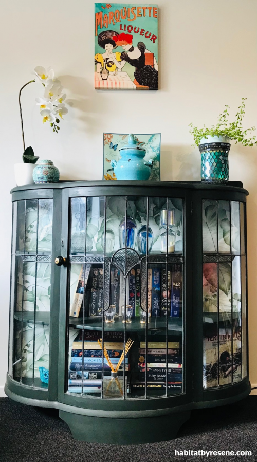 Vanessa found a bespoke glass china cabinet in a colour very similar to Resene Jurassic, placed against the backdrop of the wall painted in Resene Half Secrets, a shade described perfectly - “a whisper of the palest green and gold, enigmatically translucent in hue.”