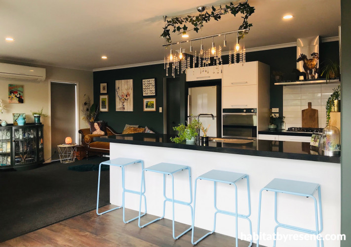 From stark white to sophisticated and moody, the kitchen and dining area has been transformed with Resene Jurassic on the walls, Resene Half Secrets on the left wall and Resene Alabaster on the ceilings and trims.