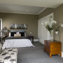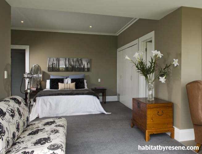 A special blend of Resene Sisal and Resene Grey Olive was used in this bedroom, designed by Leonie von Sturmer.