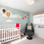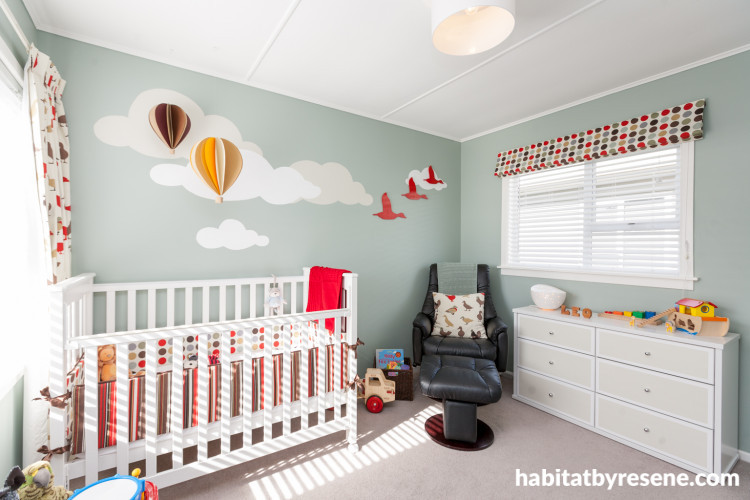 Leo's room is Resene Robin Egg Blue too, simply because we had enough left over from painting our room. I used Resene White and Resene Ecru White testpots to paint the clouds on his wall and Resene Ecru White on his drawers. The three ducks are painted in a Resene Bright Red and coated in Resene Multishield+ Glaze. In each of the kids’ rooms, I found fabrics I wanted to use and then selected paint colours to match.