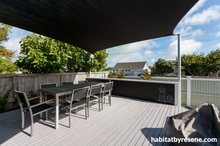 A clever addition to the deck was putting Resene Blackboard Paint on the reverse of the weatherboard balustrade to keep the kids amused.